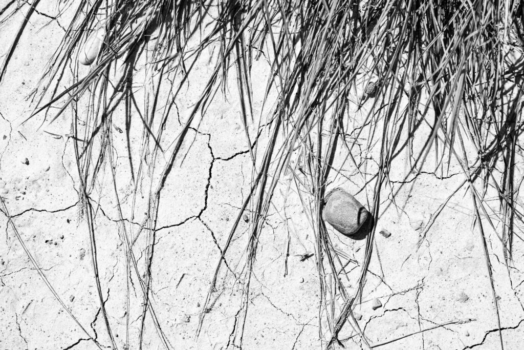 Captura uma batalha silenciosa e infinita: a grama, frágil e persistente, enfrenta a aridez implacável do solo rachado, como ondas que colidem contra a areia. No centro dessa luta, uma pedra imóvel repousa, testemunhando o passar do tempo e as infinitas transformações ao seu redor. Ela é o observador eterno, um símbolo de permanência em meio ao fluxo constante da vida. Uma obra que nos convida a refletir sobre as lutas que moldam o mundo e a quietude