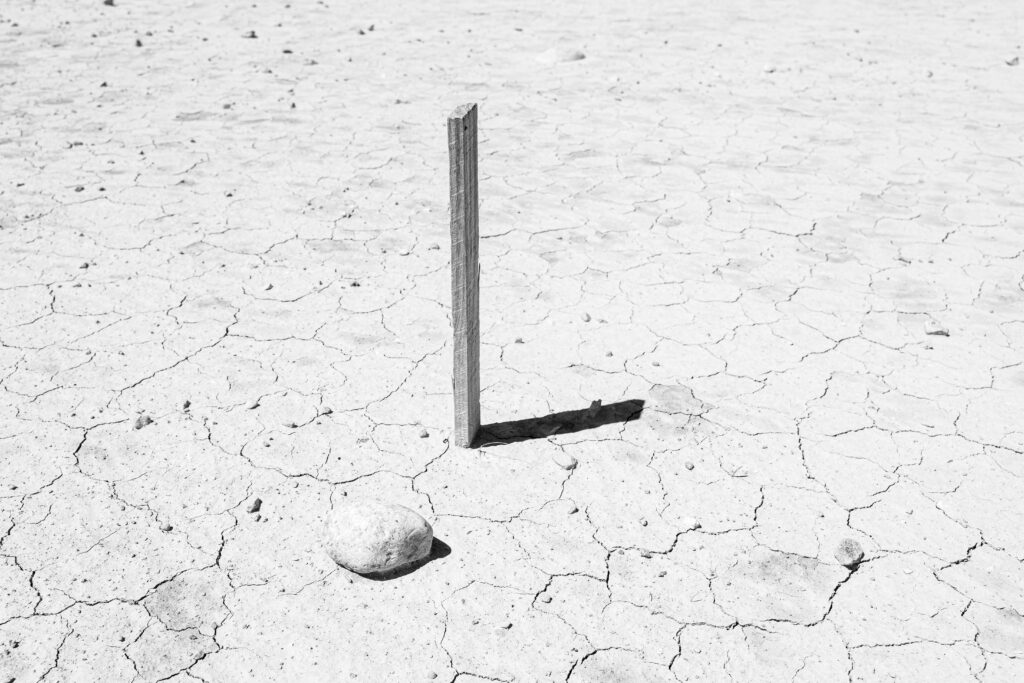 Fotografia em preto e branco é um tributo à beleza do minimalismo. A terra rachada e árida serve como pano de fundo para uma cena simples, porém profundamente poética: uma estaca fincada no solo e uma pedra ao lado, como companheiras silenciosas em um cenário despojado. A luz dura do sol cria contrastes marcantes, destacando a relação sutil entre esses dois elementos. Uma obra que convida à reflexão sobre a solidão e a conexão. perfeita para quem valoriza a estética minimalista e busca uma peça que inspire calma e contemplação.